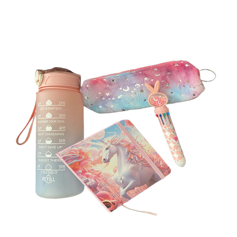 Beautiful hard cover notebook, motivational water bottle, 10 colour pen with a star and moon pencil case gift set